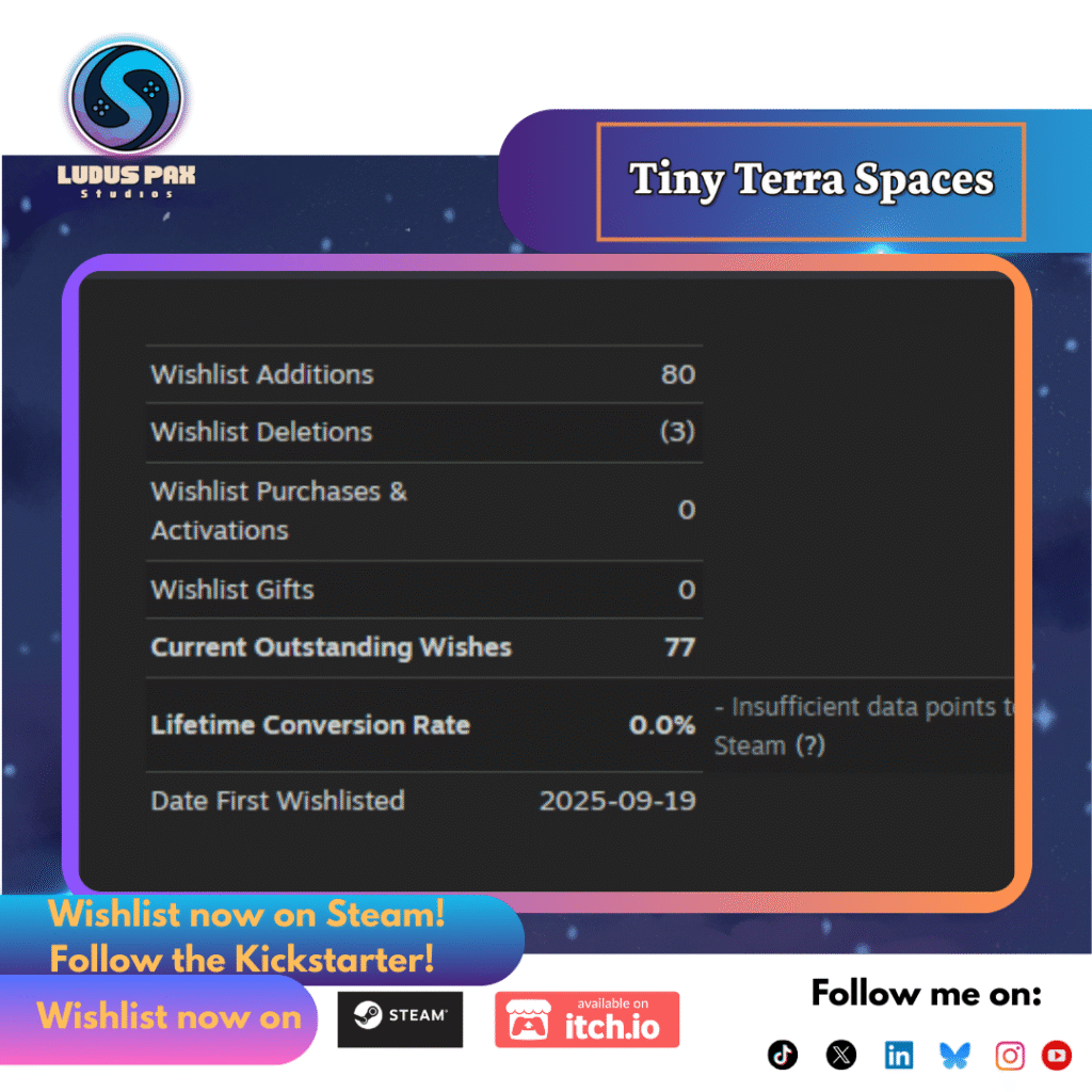 Tiny Terra Spaces has reached 77 wishlists on Steam — up from 45 only a few days ago. It’s a great milestone and a real boost for the project.
